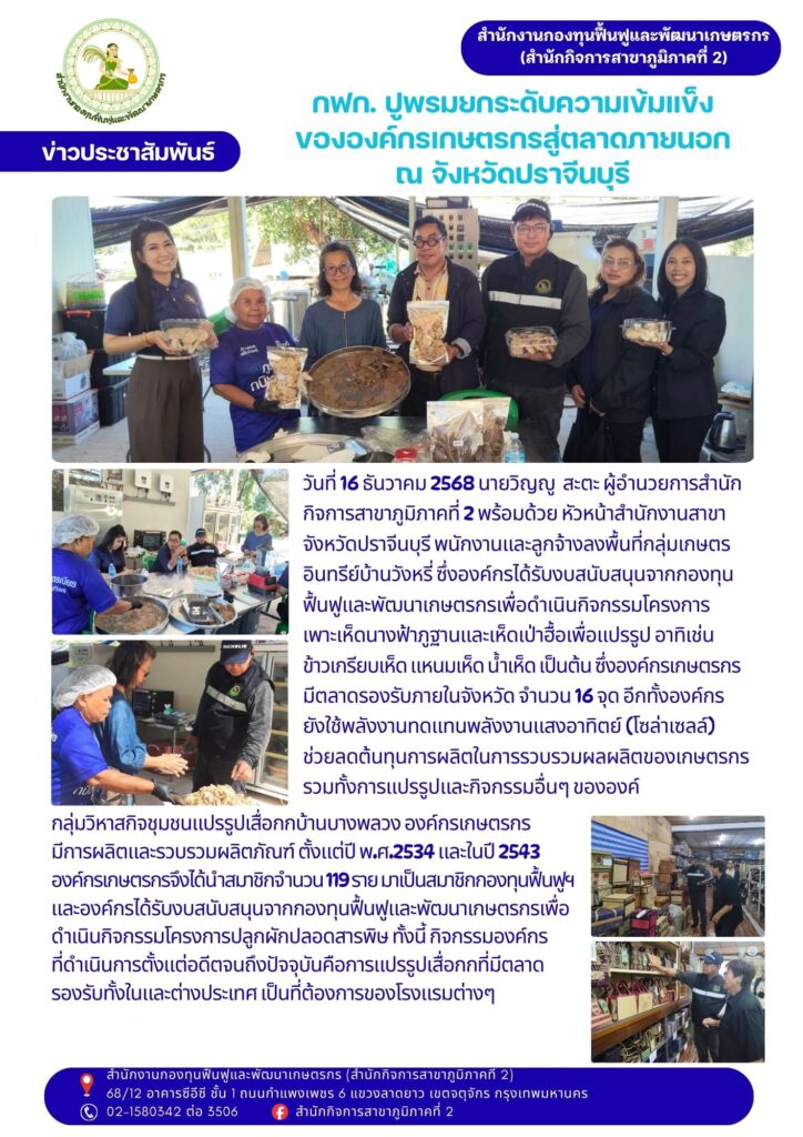 วันที่ 16 ธันวาคม 2568 นายวิญญู สะตะ ผู้อำนวยการสำนักกิจการสาขาภูมิภาคที่ 2 พร้อมด้วย หัวหน้าสำนักงานสาขาจังหวัดปราจีนบุรี พนักงานและลูกจ้างลงพื้นที่กลุ่มเกษตรอินทรีย์บ้านวังหรี่ ซึ่งองค์กรได้รับงบสนับสนุนจากกองทุนฟื้นฟูและพัฒนาเกษตรกรเพื่อดำเนินกิจกรรมโครงการเพาะเห็ดนางฟ้าภูฐานและเห็ดเป่าฮื้อเพื่อแปรรูป อาทิเช่น ข้าวเกรียบเห็ด แหนมเห็ด น้ำเห็ด เป็นต้น ซึ่งองค์กรเกษตรกรมีตลาดรองรับภายในจังหวัด จำนวน 16 จุด อีกทั้งองค์กรยังใช้พลังงานทดแทนพลังงานแสงอาทิตย์ (โซล่าเซลล์) ช่วยลดต้นทุนการผลิตในการรวบรวมผลผลิตของเกษตรกร รวมทั้งการแปรรูปและกิจกรรมอื่นๆ ขององค์