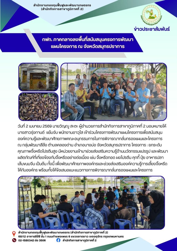 วันที่ 2 เมษายน 2569 นายวิญญู สะตะ ผู้อำนวยการสำนักกิจการสาขาภูมิภาคที่ 2 มอบหมายให้ นางสาวรุ่งกานต์ แย้มจับ พนักงานอาวุโส เข้าร่วมโครงการพัฒนาแผนโครงการเพื่อสนับสนุนองค์ความรู้และพัฒนาศักยภาพคณะอนุกรรมการในการพิจารณากลั่นกรองแผนและโครงการ ณ กลุ่มพัฒนาสีล้ง ตำบลคลองด่าน อำเภอบางบ่อ จังหวัดสมุทรปราการ โครงการ : ยกระดับคุณภาพจิ้งหรีดโปรตีนสูง มีหน่วยงานเข้ามาช่วยส่งเสริมความรู้ด้านนวัตกรรมแปรรูป และพัฒนาผลิตภัณฑ์ที่เกี่ยงข้องกับจิ้งหรีดอย่างต่อเนื่อง เช่น จิ้งหรีดทอด ผงโปรตีน คุกกี้ ปุ๋ย อาหารปลา เส้นขนมจีน เป็นต้น ทั้งนี้ เพื่อพัฒนาศักยภาพองค์กรและช่วยส่งเสริมองค์ความรู้การเลี้ยงจิ้งหรีดให้กับองค์กร พร้อมทั้งให้ข้อเสนอแนะแนวทางการพิจารณากลั่นกรองแผนและโครงการ