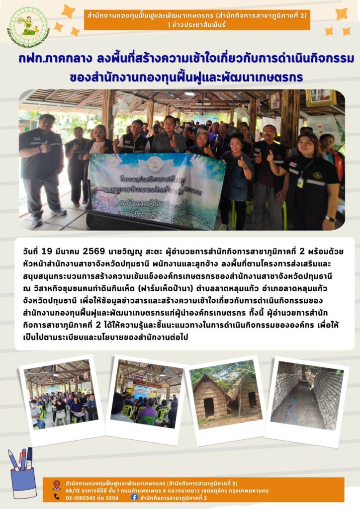 วันที่ 19 มีนาคม 2569 นายวิญญู สะตะ ผู้อำนวยการสำนักกิจการสาขาภูมิภาคที่ 2 พร้อมด้วยหัวหน้าสำนักงานสาขาจังหวัดปทุมธานี พนักงานและลูกจ้าง ลงพื้นที่ตามโครงการส่งเสริมและสนุบสนุนกระบวนการสร้างความเข้มแข็งองค์กรเกษตรกรของสำนักงานสาขาจังหวัดปทุมธานี ณ วิสาหกิจชุมชนคนทำดินกินเห็ด (ฟาร์มเห็ดป้านา) ตำบลลาดหลุมแก้ว อำเภอลาดหลุมแก้ว จังหวัดปทุมธานี เพื่อให้ข้อมูลข่าวสารและสร้างความเข้าใจเกี่ยวกับการดำเนินกิจกรรมของสำนักงานกองทุนฟื้นฟูและพัฒนาเกษตรกรแก่ผู้นำองค์กรเกษตรกร ทั้งนี้ ผู้อำนวยการสำนักกิจการสาขาภูมิภาคที่ 2 ได้ให้ความรู้และชี้แนะแนวทางในการดำเนินกิจกรรมขององค์กร เพื่อให้เป็นไปตามระเบียบและนโยบายของสำนักงานต่อไป