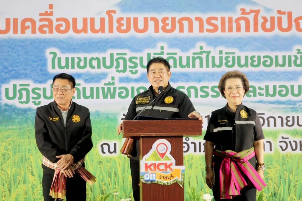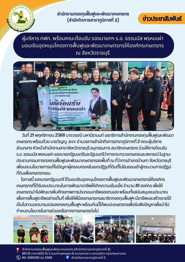 ผู้บริหาร กฟก. พร้อมคณะต้อนรับ รองนายกฯ ร.อ. ธรรมนัส พรหมเผ่า มอบเงินอุดหนุนโครงการฟื้นฟูและพัฒนาเกษตรกรให้องค์กรเกษตรกร ณ จังหวัดราชบุรี