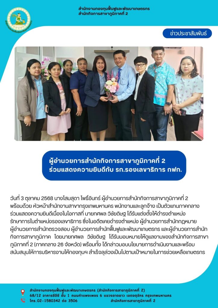 วันที่ 3 ตุลาคม 2568 นางโสมสุดา โพธิ์อินทร์ ผู้อำนวยการสำนักกิจการสาขาภูมิภาคที่ 2 พร้อมด้วย หัวหน้าสำนักงานสาขากรุงเทพมหานคร พนักงานและลูกจ้าง เป็นตัวแทนภาคกลาง ร่วมแสดงความยินดีเนื่องในโอกาสที่ นายทศพล วิชัยดิษฐ ได้รับแต่งตั้งให้ดำรงตำแหน่งรักษาการในตำแหน่งรองเลขาธิการ ซึ่งในอดีตเคยดำรงตำแหน่ง ผู้อำนวยการสำนักกฎหมาย ผู้อำนวยการสำนักตรวจสอบ ผู้อำนวยการสำนักฟื้นฟูและพัฒนาเกษตรกร และผู้อำนวยการสำนักกิจการสาขาภูมิภาค โดยนายทศพล วิชัยดิษฐ ได้รับมอบหมายให้ดูแลงานของสำนักกิจการสาขาภูมิภาคที่ 2 (ภาคกลาง 26 จังหวัด) พร้อมทั้ง ได้กล่าวมอบนโยบายการดำเนินงานและพร้อมสนับสนุนให้การบริหารงานให้กองทุนฯ สำเร็จลุล่วงเป็นไปตามเป้าหมายในการช่วยเหลือเกษตรกร