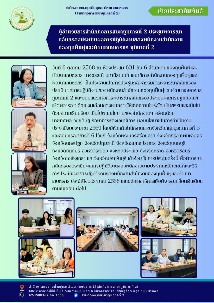 วันที่ 6 ตุลาคม 2568 ณ ห้องประชุม 601 ชั้น 6 สำนักงานกองทุนฟื้นฟูและพัฒนาเกษตรกร นางวรรณี มหานีรานนท์ เลขาธิการสำนักงานกองทุนฟื้นฟูและพัฒนาเกษตรกร เป็นประธานเปิดการประชุมคณะกรรมการพิจารณากลั่นกรองประเมินผลการปฏิบัติงานของพนักงานสำนักงานกองทุนฟื้นฟูและพัฒนาเกษตรกร ภูมิภาคที่ 2 และมอบแนวทางการพิจารณากลั่นกรองประเมินผลการปฏิบัติงานฯ เพื่อพิจารณาเลื่อนเงินเดือนของพนักงานให้เกิดความโปร่งใส เป็นธรรมและเป็นไปด้วยความเรียบร้อย เป็นไปตามนโยบายของสำนักงานฯ พร้อมด้วย นายทศพล วิชัยดิษฐ รักษาการรองเลขาธิการ มอบนโยบายในการดำเนินงานประจำปีงบประมาณ 2569 โดยมีหัวหน้าสำนักงานสาขาจังหวัดกลุ่มบูรณาการที่ 3 และกลุ่มบูรณาการที่ 6 ได้แก่ จังหวัดพระนครศรีอยุธยา จังหวัดกรุงเทพมหานคร จังหวัดนครปฐม จังหวัดปทุมธานี จังหวัดสมุทรปราการ จังหวัดนนทบุรี จังหวัดจันทบุรี จังหวัดระยอง จังหวัดสระแก้ว จังหวัดตราด จังหวัดชลบุรี จังหวัดฉะเชิงเทรา และจังหวัดปราจีนบุรี เข้าร่วม ในการประชุมครั้งนี้เพื่อพิจารณากลั่นกรองประเมินผลการปฏิบัติงานของพนักงานตามประกาศหลักเกณฑ์และวิธีการประเมินผลการปฏิบัติงานของพนักงานสำนักงานกองทุนฟื้นฟูและพัฒนาเกษตรกร ประจำปีงบประมาณ 2568 เสนอต่อเลขาธิการเพื่อพิจารณาเลื่อนเงินเดือนตามขั้นตอน ต่อไป