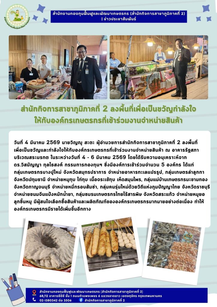 วันที่ 4 มีนาคม 2569 นายวิญญู สะตะ ผู้อำนวยการสำนักกิจการสาขาภูมิภาคที่ 2 ลงพื้นที่เพื่อเป็นขวัญและกำลังใจให้กับองค์กรเกษตรกรที่เข้าร่วมงานจำหน่ายสินค้า ณ อาคารรัฐสภา บริเวณสระมรกต ในระหว่างวันที่ 4 – 6 มีนาคม 2569 โดยได้รับความอนุเคราะห์จาก ดร.วิสมัญญา ทุลไธสงค์ กรรมการกองทุนฯ ซึ่งมีองค์การเข้าร่วมจำนวน 5 องค์กร ได้แก่ กลุ่มเกษตรกรบางปูใหม่ จังหวัดสมุทรปราการ จำหน่ายอาหารทะเลแปรรูป, กลุ่มเกษตรลำลูกกา จังหวัดปทุมธานี จำหน่ายหมูทุบ ไก่ทุบ เนื้อจระเข้ทุบ เห็ดสมุนไพร, กลุ่มแม่บ้านเกษตรกรมะขามทอง จังหวัดกาญจนบุรี จำหน่ายหมี่กรอบส้มซ่า, กลุ่มคนรุ่นใหม่ด้วยวิถีแห่งภูมปัญญาไทย จังหวัดราชบุรี จำหน่ายขนมจีนแป้งหมักน้ำยา, กลุ่มชมรมเกษตรกรไทยไร้สารพิษ จังหวัดสระแก้ว จำหน่ายหมูยอ ลูกชิ้นหมู มีผู้สนใจเลือกซื้อสินค้าและผลิตภัณฑ์ขององค์กรเกษตรกรมากมายอย่างต่อเนื่อง ทำให้องค์กรเกษตรกรมีรายได้เพิ่มขึ้นอีกทาง